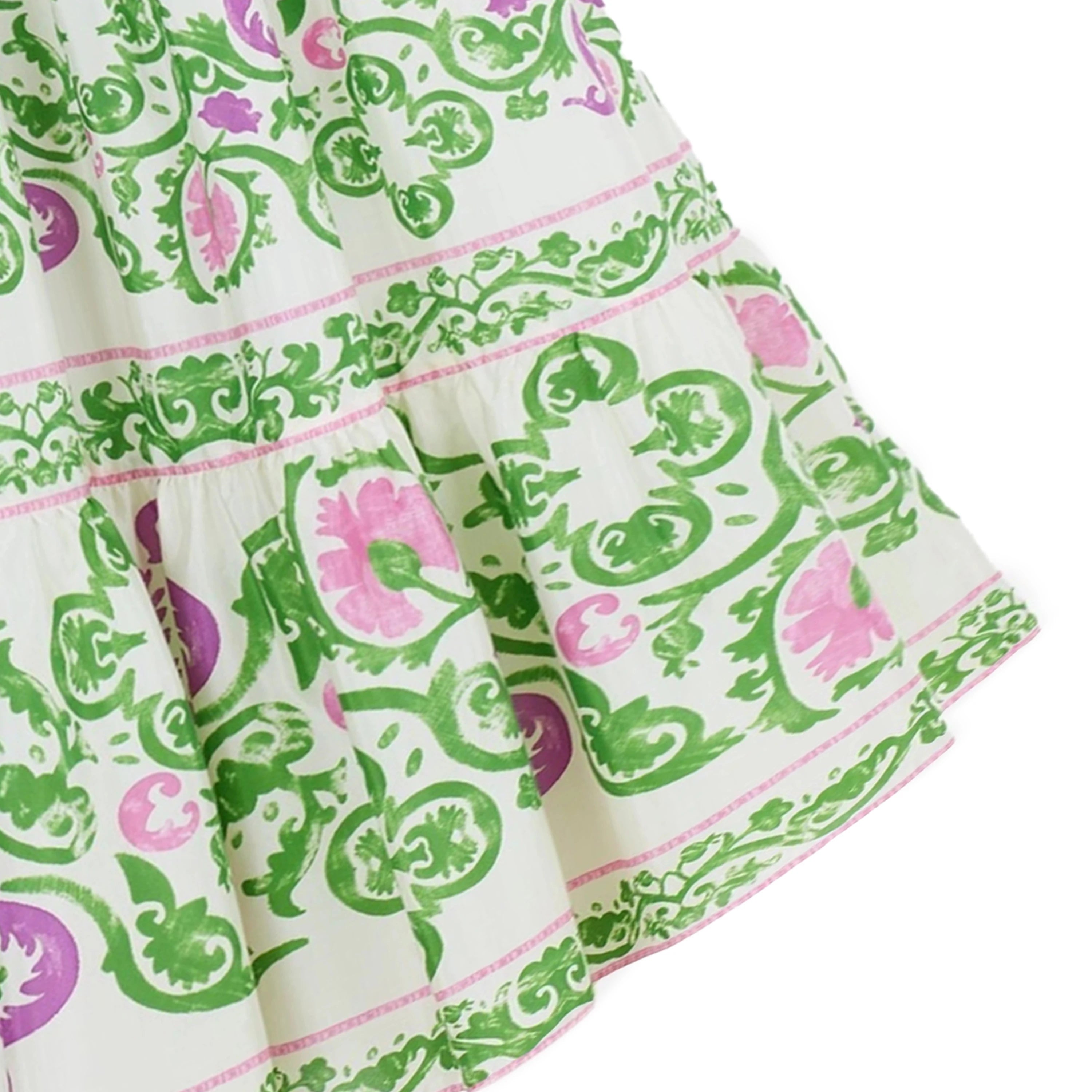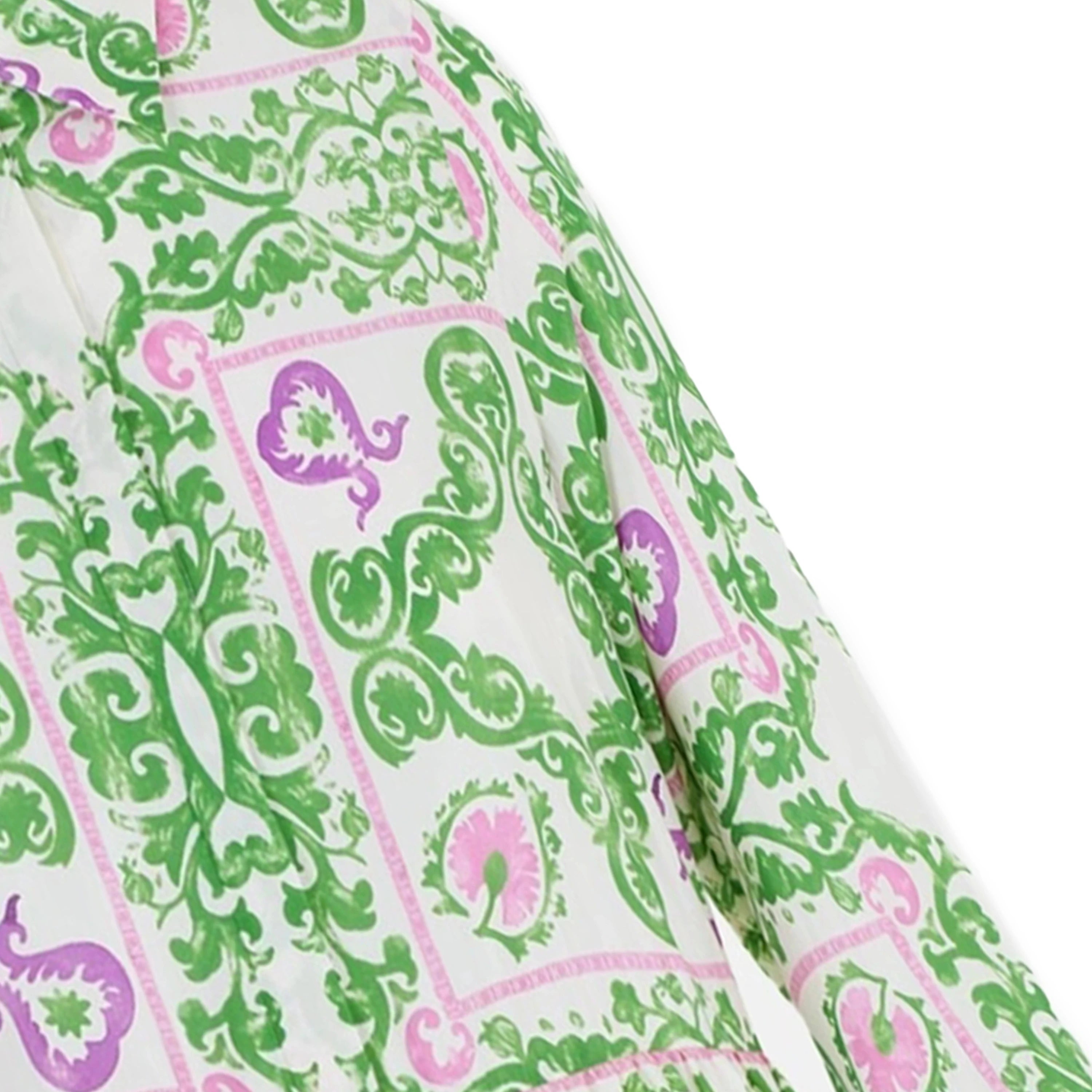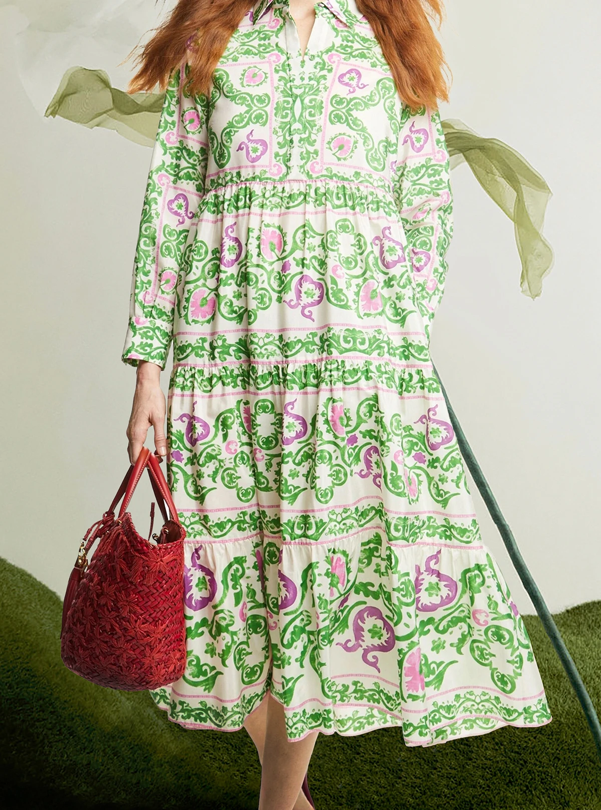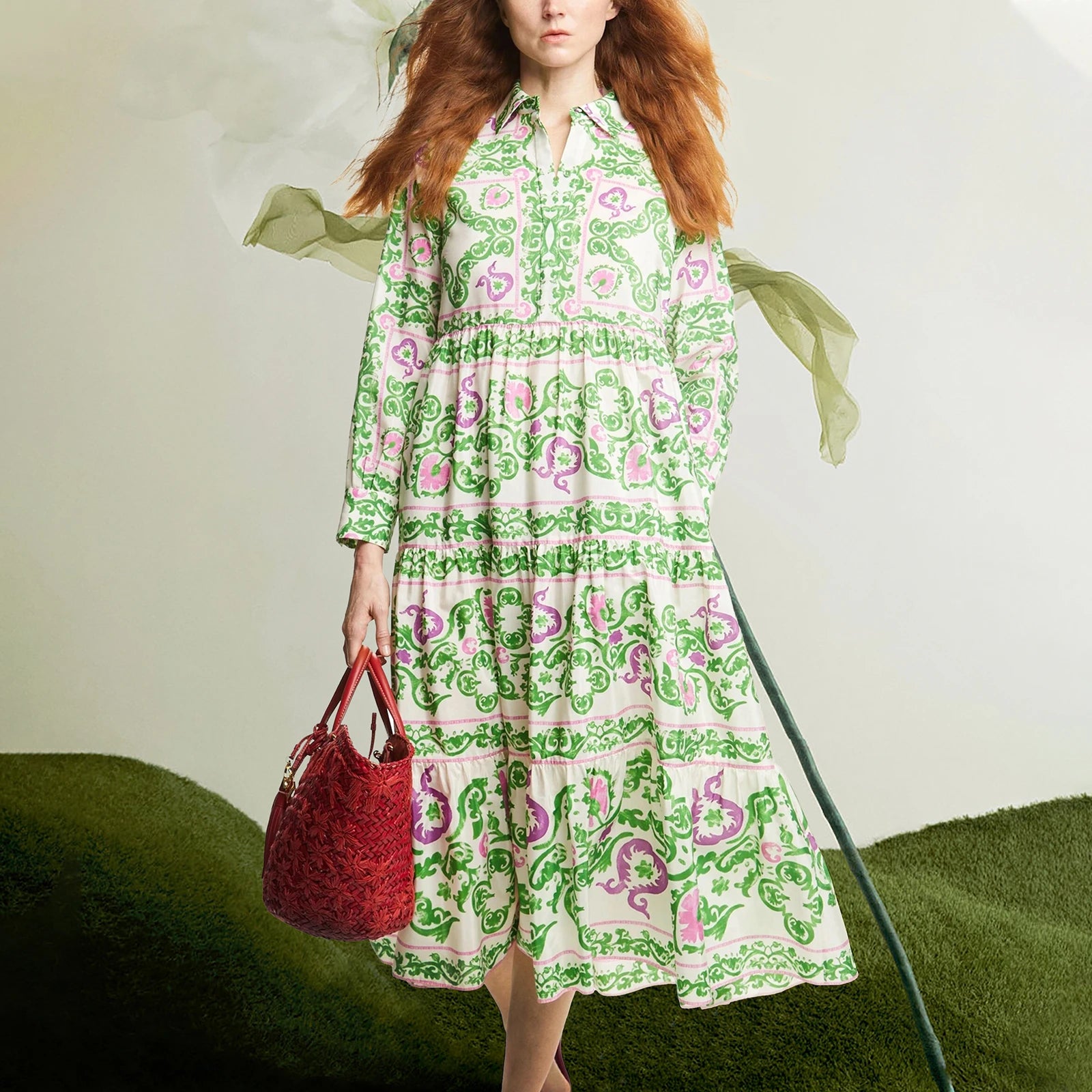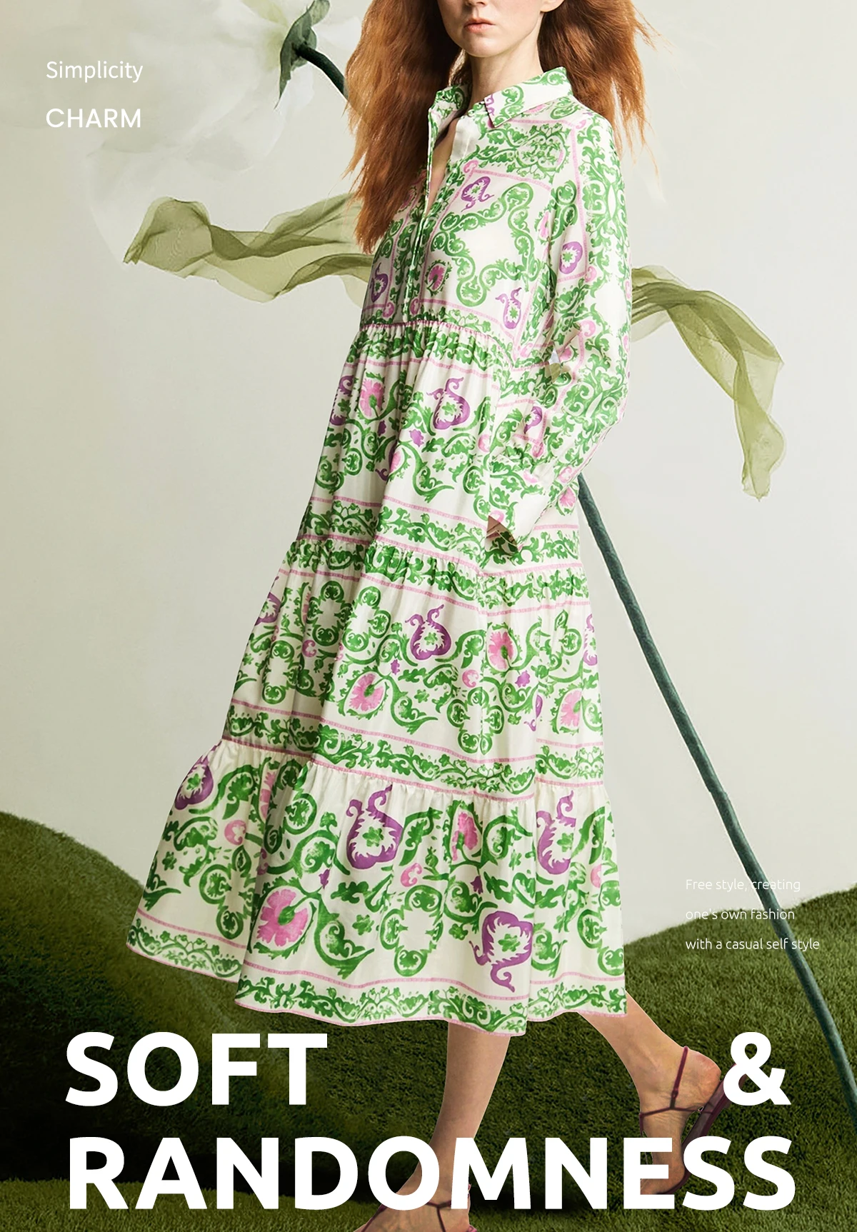 Women's Dress Loose Lapel Long Sleeve Green Flower A-line Long Dress
